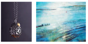 Mellan målningens levande yta och metallens tydliga linje uppstår en rörelse – silver lining – där material, form och rytm möts.
